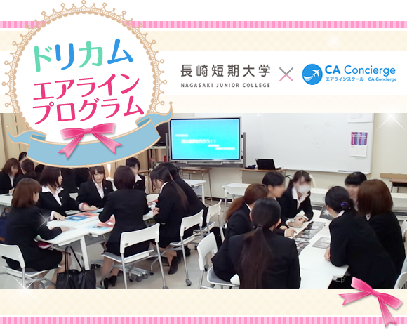 平成27年度より、長崎短期大学様とタイアップし、国際コミュニケーション学科の学生さんを対象に、CAコンシェルジュのエアライン講座が受講できる「ドリカムエアラインプログラム」が始まりました!